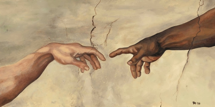 نجد الله يخلق آدم بيديه وحين نتحدث عن آدم نتحدث عن شخص مفرد جامع فهو شخص مفرد لكنه يرمز إلى جميع البشر. استخدم الوحي الإلهي صورة الله الفنان ليصور خلق الإنسان “صورة رمزية”.