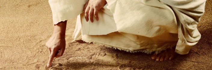 “وَلَمَّا اسْتَمَرُّوا يَسْأَلُونَهُ انْتَصَبَ وَقَالَ لَهُمْ: «مَنْ كَانَ مِنْكُمْ بِلاَ خَطِيَّةٍ فَلْيَرْمِهَا أَوَّلاً بِحَجَرٍ!» ثُمَّ انْحَنَى أَيْضاً إِلَى أَسْفَلُ وَكَانَ يَكْتُبُ عَلَى الأَرْضِ.”