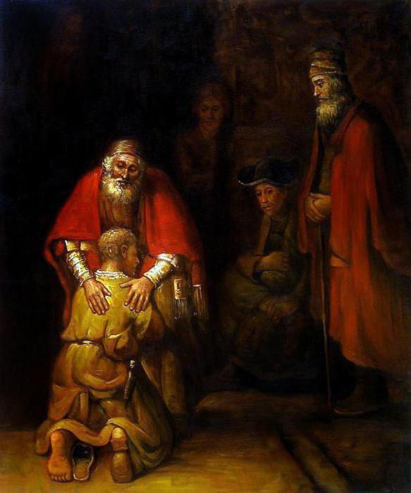 تبيّن لوحة ريمبراندت المشهد الأساسي من المثل الذي رواه يسوع، والأشخاص الماثلون فيها يجسّدون بأمانة الأشخاص المذكورين في المثل. ولكن يسوع، الذي يطيب له أن يتكلم بأمثال، يريد أن يعلن إنجيل الخلاص، أي هذا الخبر السار بأن الله يحبنا دائماً لأنه بالذات أب. وعليه، فإن الأشخاص المذكورين في المثل يتّسمون بالطابع النموذجي والبعد الشامل. والقارئ ذاته، الذي يتعامل مع المثل بانتباه (عن طريق القراءة، أو الإصغاء، أو المشاهدة) فإنه مدعو إلى الشعور بأنه معنيّ. وإذا ما بقي غريباً عما يجري وبعيداً عن الرسالة التي ينطوي عليه المثل، فإنه يفوّت فرصة سانحة لأن يقرع الله باب قلبه.